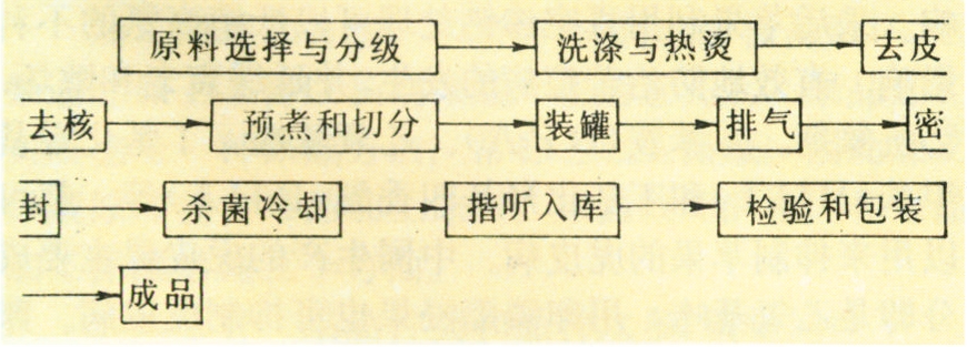 加工过程因水果种类、品种、产品类型和产品规格的不同而差异较大,但这种差异主要是在果品装罐前的原料预处理过程中,而装罐后的加工过程则大同小异。其主要的工艺流程如下: