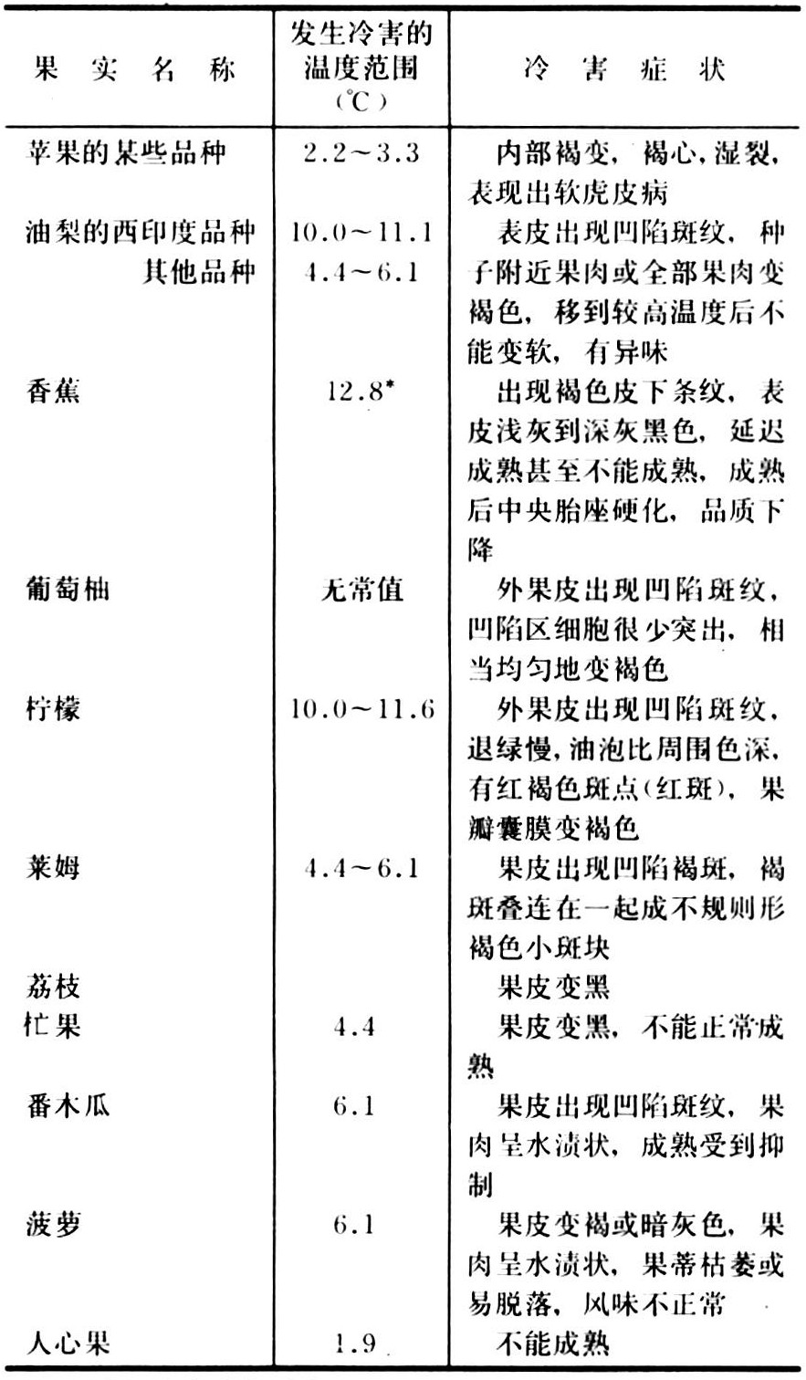 果实组织在其冰点以上的低温下发生的伤害。冷害通称低温伤害或低温溃变,是果品贮藏过程中一种常见的生理病害。热带和亚热带果实,由于系统发育处于高温多湿的气候环境中,在低温环境下贮藏容易发生冷害;温带果实如苹果、梨等在不适合的低温下贮藏,亦会发生冷害。冷害的症状是组织内部变黑和干缩,外表出现凹陷斑纹,不能正常后熟,有异味,内部和外表的症状随果实种类不同而异(表)。苹果的冷害一般是在贮藏环境温度高于果肉内冰点温度(-2.5℃左右)、低于3.3℃范围内发生,当温度高于4.4℃时就不发病。按其发病部位大致分为两大类,即果肉低温溃变和果心低温溃变。果肉低温溃变开始时果肉呈浅褐色,以后逐渐向内向外扩展,颜色变深,只有进一步发展才能波及到果心,受害组织和健康组织之间的界限模糊,通常在果皮下有一层2~3毫米厚的健康组织。因此,当果实内部的冷害已相当严重时而外观尚好,只有病变很严重时果皮才变色,甚至呈暗透明的水渍状。果心低温溃变也称褐心病,主要是果心发生病变,其症状与二氧化碳伤害相似,二氧化碳伤害果肉组织呈暗褐色,中有小空洞,而低温溃变的组织中通常没有空洞。冷害的发生与贮藏低温和在此温度下的持续时间有密切关系。在导致发生冷害的温度下,时间越长,温度越低,冷害发生越快。仅是低温,如作用时间短,并不会造成伤害。将温度逐步降低能使香蕉、油梨和鸭梨的冷害大大减轻。果实的大小,果皮的厚薄粗细,成熟度等,对冷害的发生迟早和程度有一定的影响。有关冷害的机制问题,还处在探索研究阶段。防止冷害的根本方法是将果实在不会发生低温伤害的温度下贮藏。