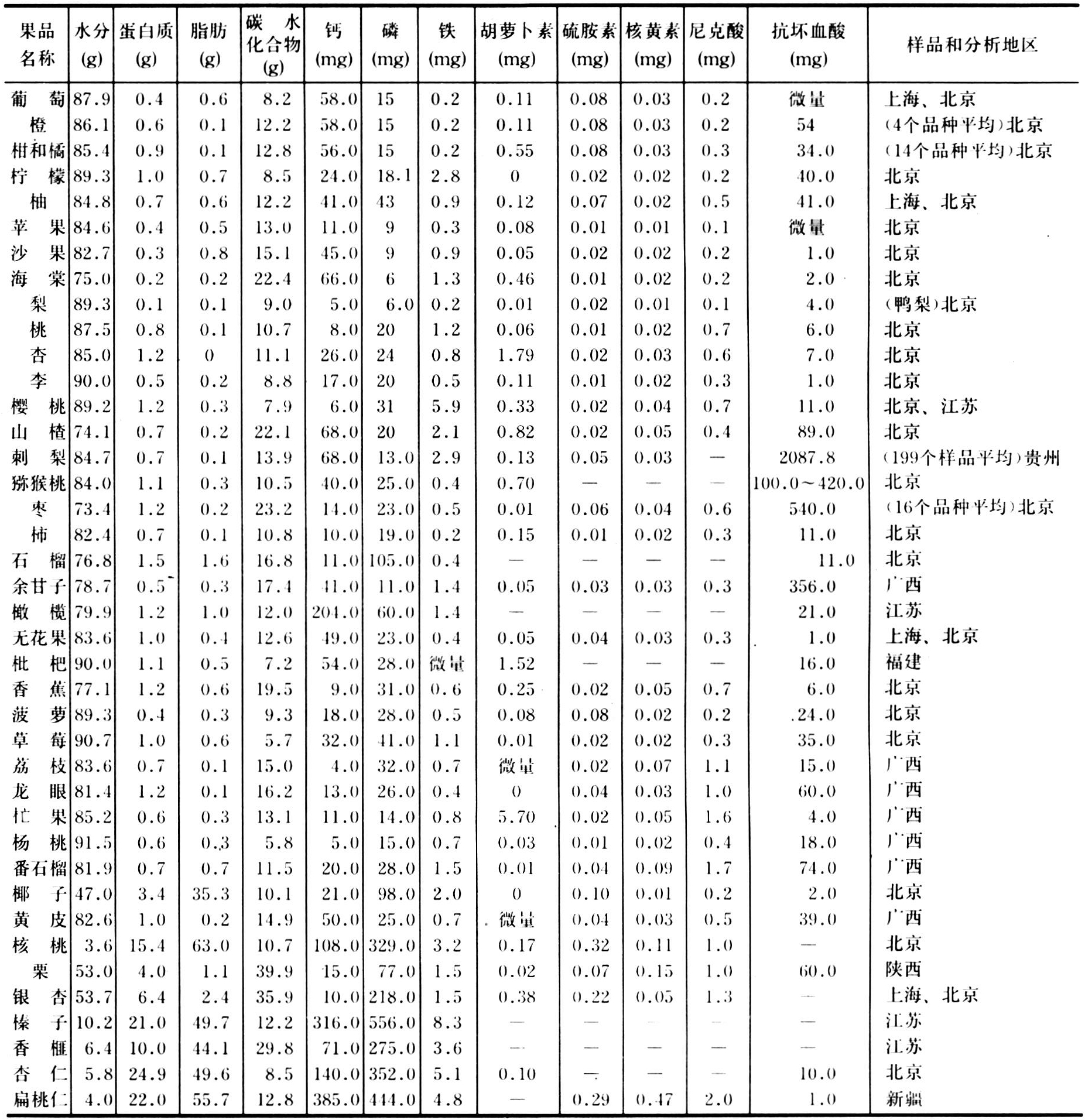 对调节人体生理机能,保障身体健康方面有重要作用。富含维生素C(抗坏血酸)的果品有刺梨、猕猴桃和枣,还有山楂、柑橘、草莓、鳄梨等含维生素C也较多。一些果品含有丰富的胡萝卜素(维生素A源),以杏、枇杷、忙果含量较多,其次为李、樱桃、山楂、柑橘等。含维生素B1和B2较多的果品有鳄梨、忙果、香蕉、甜橙、核桃、板栗等。此外,一些果品还含有维生素P、维生素D、维生素E、叶酸等。维生素在热加工过程中往往大量损失,特别是维生素C最不稳定。因此,新鲜果品就成了供应人体所需多种维生素的重要食品。