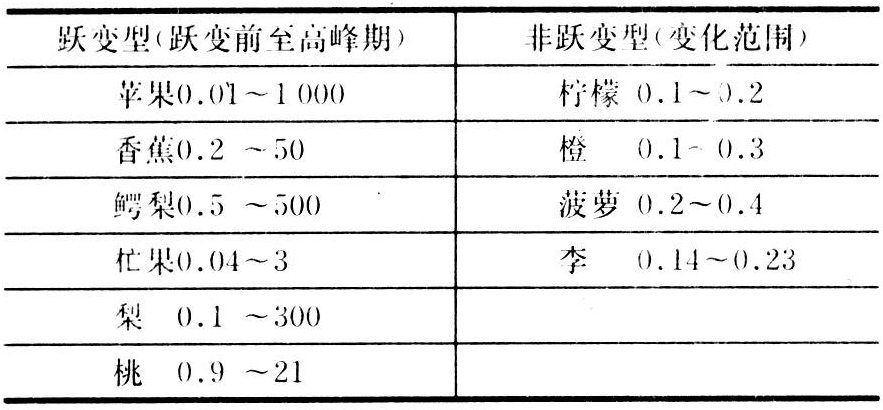 跃变型果实成熟时乙烯急剧增加,如苹果跃变前果实中乙烯浓度在0.1ppm以下,高峰期达到几百以至几千ppm,增加3~4个数量级,不同种类和品种之间差异很大(见表)。
