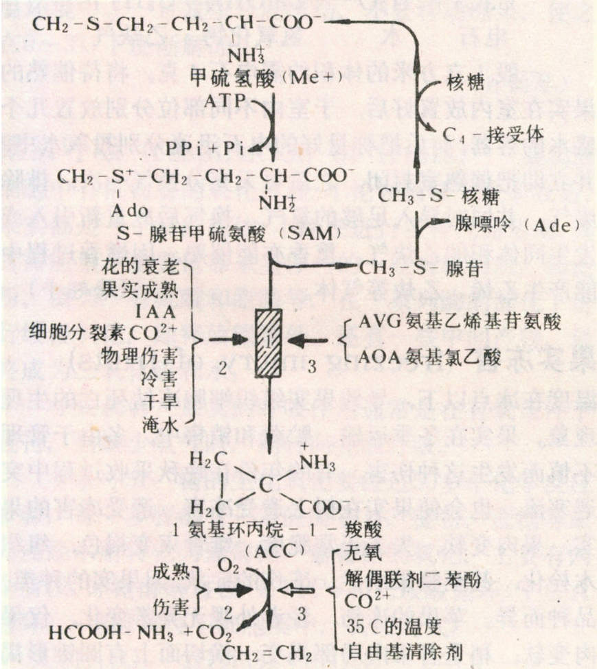 1979年美国亚当斯(D.O.Adams)和杨祥发确定了果实中乙烯生物合成的途径是:蛋氨酸→S-腺苷蛋氨酸(SAM)→1-氨基环丙烷基羧酸(ACC)→乙烯。跃变型果实在乙烯作用下诱发成熟,成熟时乙烯刺激1-氨基环丙烷基羧酸合成,促进乙烯产生,形成乙烯自我催化,而不断大量产生(见图)。跃变型果实乙烯增加的时间进程与呼吸速率上升以及其他成熟作用差不多同步进行。非跃变型果实缺乏乙烯自我催化能力。但对已经跃变的果实,外源乙烯则不再刺激呼吸增加。对于非跃变型果实,外源乙烯也能促进呼吸增加,而且与所用的乙烯浓度成正比,除去乙烯后呼吸即恢复,不能诱发呼吸跃变和乙烯继续增加。在乙烯作用下其他与成熟衰老有关的反应都被促进,如叶绿素分解,脱绿,增加着色;淀粉水解,果实软化。