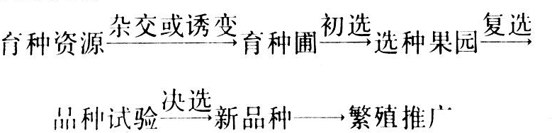 果树品种选育工作的步骤。杂种实生苗从播种到结果鉴定,或引入种苗栽植到结果,占地大,需要时间长。为加速育种进程,提高育种效率,使新品种尽早在生产上应用,必须建立科学的育种程序和相应的育种制度。