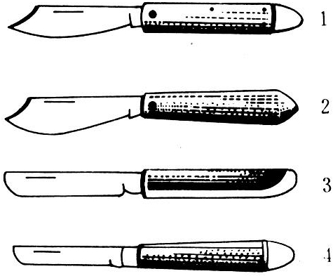 有①芽接刀。用来削取接穗和切割砧木,均为可折式,由刀刃、刀柄和剥皮器构成。常用的为刀背前端斜面略凹,刀口呈弧形,刃长5厘米左右,刀尾为扁而薄的角质剥皮器,用来剥开砧木切口的树皮以利芽片插入;另一种刀背及刀口均较平(图1)。还有用于贴皮芽接或套筒芽接的特制芽接刀,也可用保安刀片自制而成。②切接刀。枝接时切削接穗和砧木,常用的为非折式全金属制品,也有可折式(图2)。③劈接刀。劈开较粗的砧木,并将砧木劈口撬开以利接穗插入。劈接刀形如菜刀,刀背先端有一尖形楔状物(图3)。④根接刀。用于柑橘、葡萄等树种的根接,有单柄和双柄两种,单柄的刀刃弯曲,双柄的刀刃呈直角(图4)。⑤舌接刀。是葡萄舌接的专用工具。有的国家采用嫁接机进行舌接,成活好。