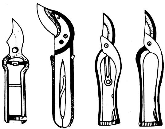 用来剪截接穗和砧木枝干、梢。由剪刃、手柄、弹簧等3部分构成,其形状各地不一,(图5)为中国、英国、法国常用的修枝剪,欧美使用的规模较大,日本使用的较小,中国使用的大小居中。