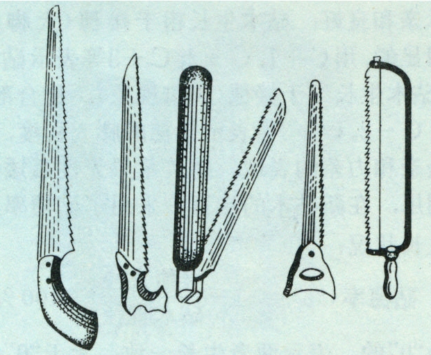 用来锯除大枝。由手柄和锯条组成,形状和种类较多,有可折式和固定式两种(图6)。小型折叠式携带方便,但不如固定式牢固。