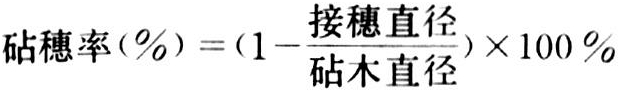20世纪60年代以前,果树栽培中曾把砧穗生长粗细是否一致(即有无大小脚现象)作为判断亲和情况的重要依据,韦伯(H.J.W ebber.)根据柑橘嫁接树砧穗的生长情况,提出了柑橘砧木亲和性的分级标准,砧穗生长粗细一致,接合部不明显,用C表示亲和良好;砧木生长粗于接穗(大脚现象)接合部明显的,用C+1、C+2、C+3等表示砧木膨大的程度;砧木生长细于接穗(小脚现象),接合部明显,用C-1、C-2、C-3等表示接穗的膨大程度,后两种情况都是亲和力差的表现。随着苹果无性系矮化砧木的普及利用,在新砧木的选育中采用了砧穗率来表示砧穗的生长状况: