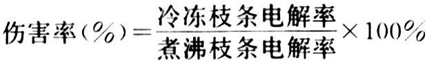严寒冬季果树发生冻害的时候,是实生苗抗寒力最好的鉴定机会。用分级方法记录冻害程度,可以从实生苗的抗寒性差异,选出最抗寒的后代。但严寒天气,并不是年年都有,有时甚至10年才出现一次。借助人工冷冻的方法可以加快鉴定的效率。常用的人工冷冻鉴定方法有:①生长箱鉴定法(labor-atory chamber method),将品种和实生苗先放在0°C的冷冻器内,每小时降低2℃,直至降低到-43℃,置于强烈的冷冻环境中保持8小时,然后将枝条放在27℃(日温)和15℃(夜温)的生长箱内,经3周后,统计复活的枝条和组织变褐的枝条数,统计的等级是1(不能恢复)~10(完全没有冻害)级。这种方法适于短期内进行大量杂种后代抗寒力的鉴定,灵敏度高。②氯化三苯四唑法(triphenyl tetrazolinm chloride meth-od),简称TTC法。这种方法的理论依据是生活组织具有还原能力,能使无色的TTC还原为红色。TTC还原状态可用目测或用比色法(在435毫微米波长处)测定,根据从红色到无色的变化程度,判断植物的抗寒力或受冻程度。本方法的特点是取样非常小,能够比较准确地测定某些微小或局部的受害程度。③电导法(conductivity method),将经过人工冷冻的枝条或其它组织,置于清水中浸泡10小时,用DDS-11型电导仪测定冷冻枝条浸出液的电导率。被冻死的细胞由于外渗作用而将电解质浸透到水中,活细胞外渗到水中的电解质则很少。再将测定过的枝条,在蒸锅中煮沸30分钟,同样置于清水中浸泡10小时,测定经蒸煮枝条的电解率,通过两次测定的电解质传导率计算出外渗电解质的百分率(或称伤害率)。计算公式为:
