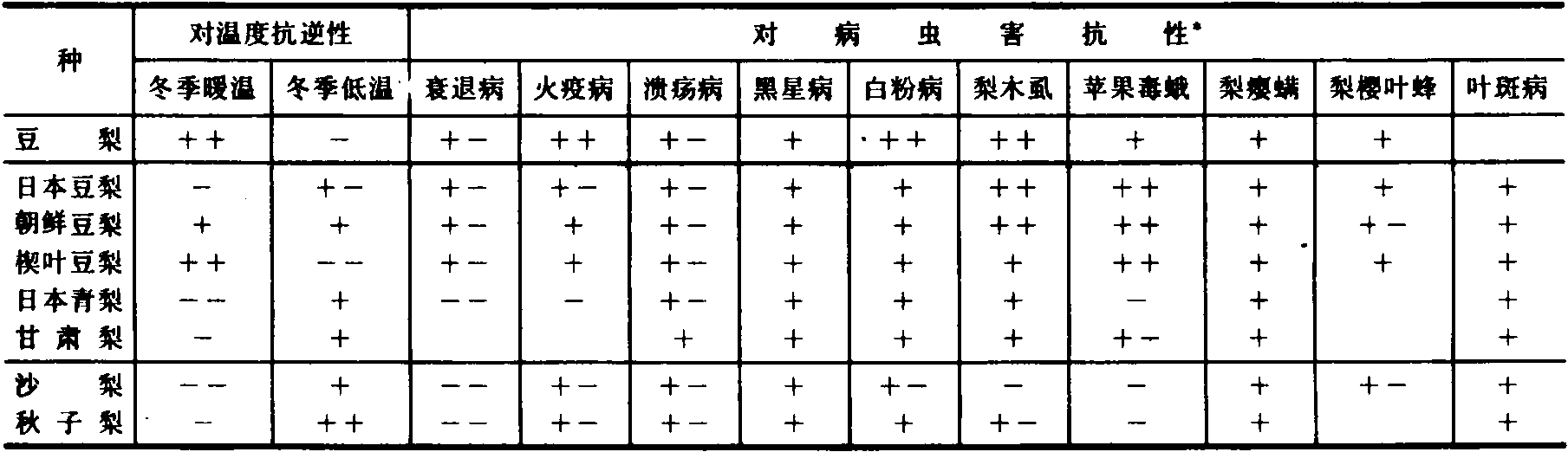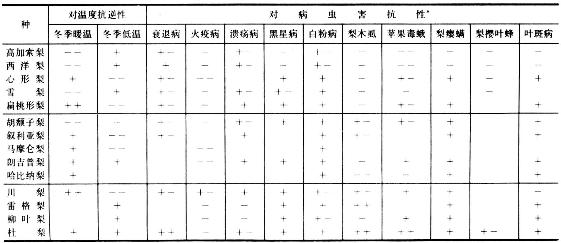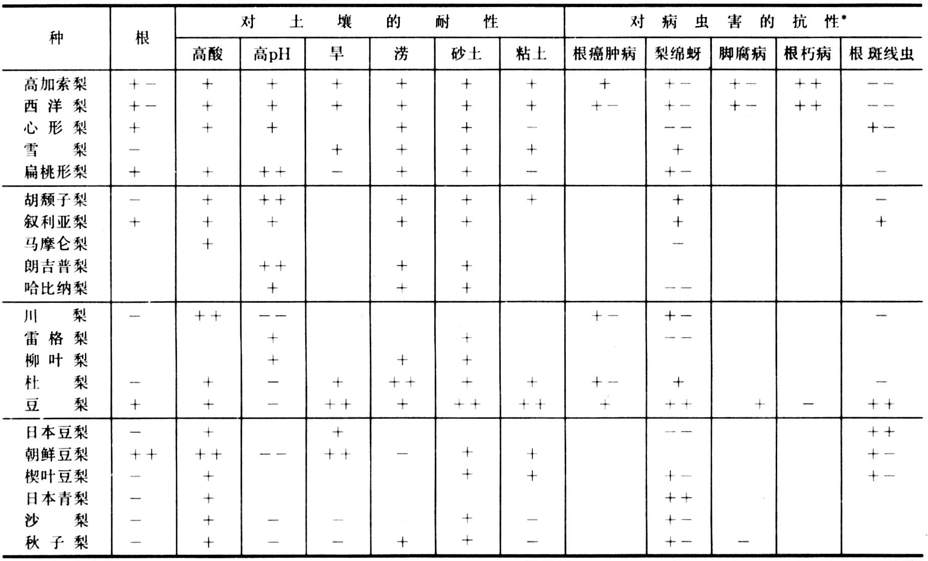 中国在1950年后,在特定性状的调查研究方面作了一些工作。80年代开始比较系统的开展了特定性状鉴定评价。经调查研究,梨的抗寒品种有秋子梨中的花盖安梨、甜秋子、龙香等,抗黑星病的品种有西洋梨的大多数品种,如康弗伦斯、日面红、安古列姆等和白梨的蜜梨、锦丰、早酥、银梨及胎黄梨等。耐旱力强的品种有贵妃、康德、乔马、奥丽亚等,耐旱力较强的品种有胎黄梨、黄县长把梨、莱阳茌梨、巴梨、三季梨等。此外,作砧木用的野生种中,杜梨耐寒、耐旱、耐涝力极强,且具有很强的耐盐碱能力。豆梨适生于温暖潮湿气候,对梨树腐烂病有高度免疫力,适于作沙梨的砧木,麻梨作砧木时丰产、寿命长、亲和力强(见表3、4)。