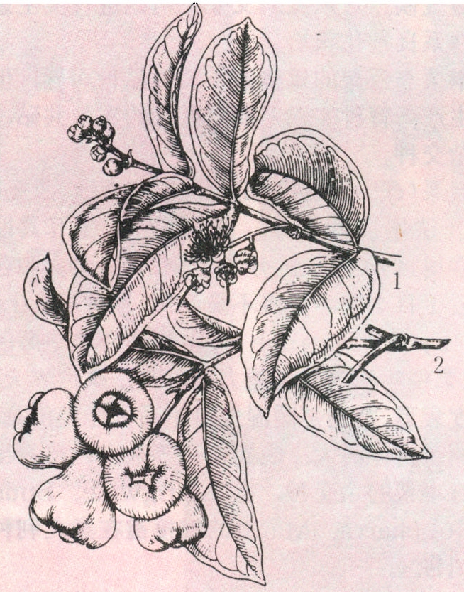 树高十余米。树干多分枝,树冠自然圆头形。嫩枝扁,暗红色;老枝灰褐色。叶对生,革质,椭圆至长圆形,长10~22厘米,宽5~8厘米,先端钝或稍尖,基部狭,呈圆形或心形;叶柄极短而厚。聚伞花序顶生或腋生,有花数朵、白色,几无柄;萼管倒圆锥形;雄蕊多枚。果倒圆锥形或钟状,表面有光泽、蜡质,长4~5厘米,顶部凹陷,有宿存的肉质萼片;果肉海绵质,有香气。种子1枚或无(见图)。在华南亚热带条件下3月至4月开花,5月至6月果实成熟。