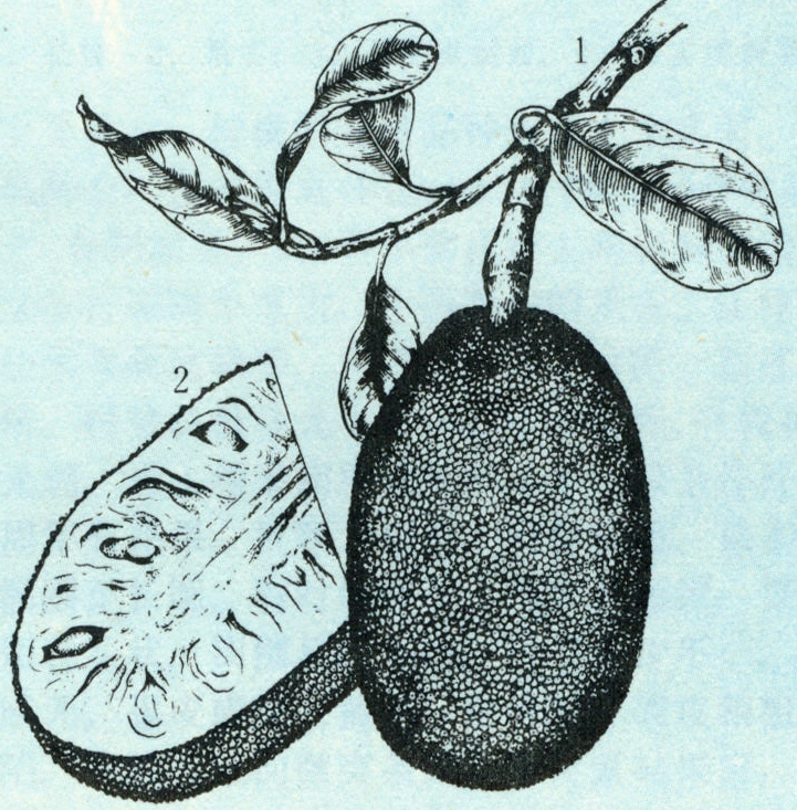 高10~20米或更高。具白色乳汁。树皮黑褐色。枝有环状托叶痕。单叶互生,厚革质,椭圆形或倒卵形,长12~22厘米,宽6~9厘米,先端钝,基部广楔形,全缘(幼苗期有些叶片3裂),两面无毛,背面粗糙,叶柄长1.5~2厘米。在主干和粗大的分枝或粗大的侧枝上长出结果枝。头状花序顶生或腋生,雌雄同株;雌花序长4~15厘米,直径3~5厘米,鲜绿色,着生位置较同一结果枝上的雄花序低;雄花序长约5厘米,直径约2厘米,表面较光滑,暗绿色;花很小,白色。果大,椭球形或球形,重4~20千克或更大,外皮有六角形的瘤状突起,熟后香气浓;瘦果卵形或椭球形,偏扁,长约3厘米,其假种皮由花瓣裂片发育而成,肉质或浆质,金黄色,鲜食香甜爽滑,有特殊的蜜香味。种子浅褐色,卵形或长卵形,煮熟后味如栗(见图)。花期2月至4月。果熟期6月至8月。