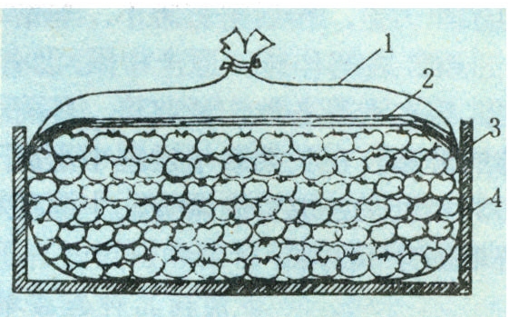 用缸或箱子盛柿子,以75%的酒精或白酒喷于果面上,密封4~5天,果实变为红色,略带橙黄,质软甘甜。改良酒精法是用15千克装的纸盒,按纸盒大小用0.03毫米厚的聚乙烯做成薄膜袋,将柿子装入袋中,按每千克柿子加入4毫升酒精。为避免酒精直接接触果实可使用固态酒精,把1~2块固态酒精(含40%)直接放入纸盒底部,然后密封。亦可在果面铺一层比较厚的吸湿纸,使酒精吸到吸湿纸上,然后密封(图2)。此法称吸湿纸酒精蒸气脱涩法。用此法脱涩,柿子软化现象减少。并可用在运输途中,亦称运输脱涩。