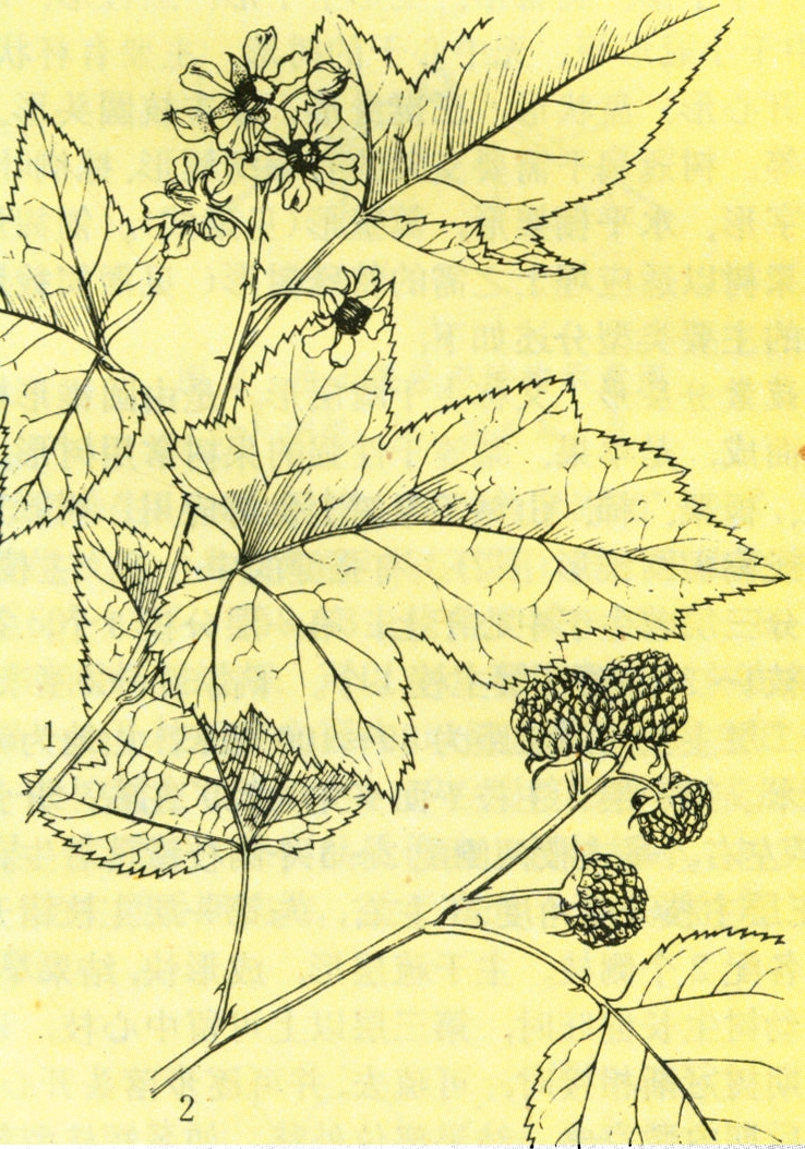 聚生核果聚生在突起的花托上,果实红色,黄色,黑色或紫色,成熟时呈帽状并与花托分离。①红树莓(Rubus idaeus L.),广泛分布于欧洲、北美及亚洲东部,本种变种较多,栽培的主要有二种:欧洲红树莓(R.idaeus L.var.vulgatus Arrhen.),丰产,果大,颜色鲜艳,最先被驯化栽培;美洲红树莓(R.idaeus L.var.strigosus(Michx.)Maxim.)果实小,但抗寒、抗旱。早期栽培的树莓品种几乎全来源于这两个变种。经过几个世纪的选择培育,现在已育成许多果大、味美、丰产的优良品种,例如Jochem Roem、Malling Jewel、Malling Promise等品种果实直径达40~50毫米。美国品种Latham果实虽稍小,但是抗寒、丰产、品质好,欧美许多国家广为栽培。苏联的Новость Кузьминa、Викинг特别抗寒,品质好,另外Early June早熟,Mammoth Thornless无刺,而Indian Summer、Durham、August Red则一年多次结果。中国品种有红树莓,在东北栽培多年,果实虽小,但甜酸适口,香味浓郁,丰产,抗寒,抗旱,枝无刺,是育种的优良种质。中国野生红树莓种质资源有2个值得重视的种:蓬蘽悬钩子(R.crataegifolius Bge.)(见图),分布在东北、华北、西北、植株直立、健壮,根系发达、抗寒,可耐-40℃低温,抗旱,在荒地、路边、瘠薄干旱山坡上都能正常生长结果,是抗寒育种、抗旱育种的珍贵材料;库页悬钩子(R.sa-chalinensis Levl.)主产于长白山,大兴安岭,果实甜酸适口,香味浓,抗寒力强,耐-45℃低温,可用于抗寒育种。②黄树莓,是红树莓的一个黄色变异类型。也有许多品种,如英国的Malling Orion,美国的Golden Queen,中国的黄树莓等,一般不如红树莓丰产,很少有大面积栽培的,多见于庭院果园。③黑树莓(R.occidentalis L.),为美洲种,果实黑色,香味浓,枝上散布坚硬大刺,根系分布深,抗旱,很少发根蘖。一年生枝生长到晚夏向下弯呈拱形,当梢端触地时即生根入土,形成新株。这种特殊习性的繁殖方法,被称为先端压条。黑树莓抗寒力较差,适宜在温暖地区栽培,优良品种有Cumberland、New Logan、Black Knight等。其中,Black Knight是美国20世纪70年代育成的新品种,从仲夏直到秋末果实陆续成熟,可不断采得鲜果,更适合于庭院栽培。④紫树莓,是红树莓和黑树莓的杂交种。常比亲本生长旺盛,丰产。繁殖习性多倾向于黑树莓。优良品种有Brandy-wine、、Sodus、Clyde。