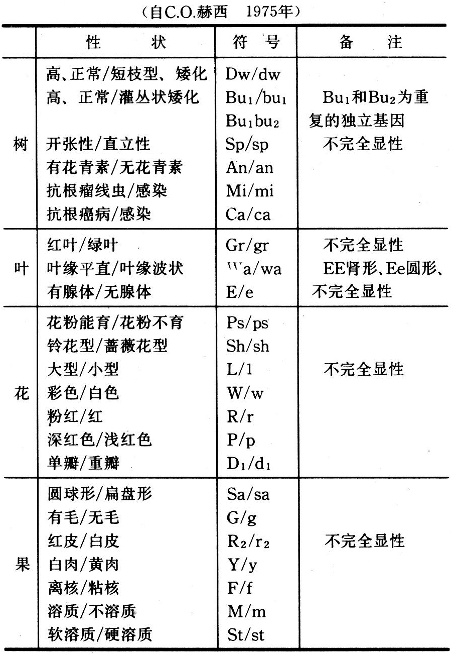 桃是自花结实果树,连续自交也不表现出衰退现象,所以桃比其它果树更容易在杂交中估算其遗传动态。单基因控制的桃的遗传性状研究已比较清楚,得到许多研究者的证实如表1。