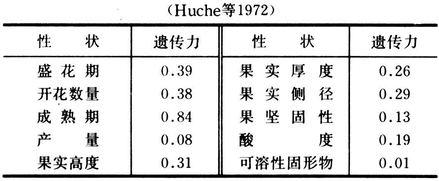 果实成熟期的遗传力,用年份影响加以调整后是最高的,为0.84。这说明这个群体对该性状具有大量加性遗传的变异,用高度选择强度作方向选择的进展将会很快。像盛花期,开花数量和果实侧径等性状都有很大的遗传力,而产量、果实酸度、果肉致密度和可溶性固形物等的遗传力则小。据认为,后面这些性状大都是粗略的估测(分等级)或不精确的数据。如可溶性固形物、产量(丰产性)等有些估算常受树龄的影响。有几种性状受遗传控制似乎是另有原因的。例如可溶性固形物、如果测定标准不恰当,估算的遗传力就很低,因而提出研究桃的遗传力,首先要确定对测定各种性状的标准。只有标准合适,估算的遗传值才好使用。