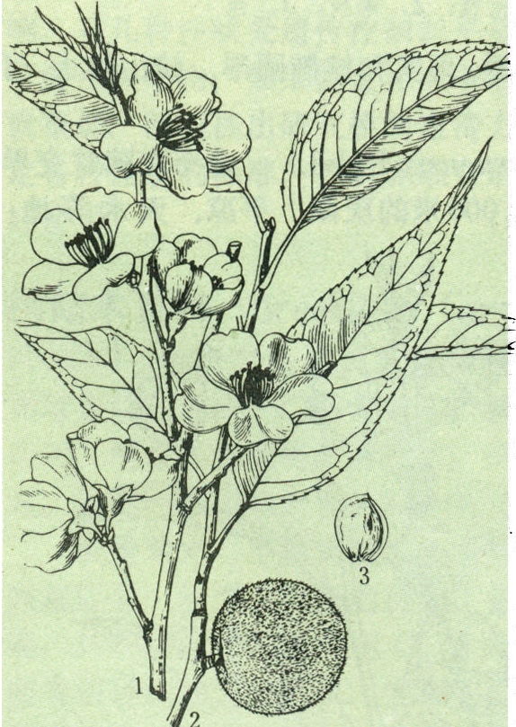 世界上栽培桃多属此种。花有铃形和蔷薇形之分。果实大小、形状变异很大。果肉色泽有白、黄、红色。核有粘核、离核、软核,及椭圆形、扁圆形等区别,具深沟纹或呈蜂窝状孔纹,较毛桃和山桃大。世界上桃的著名品种如上海水蜜、肥城桃、爱保太(Elberta)、红港(Red Haven)等。它有4个变种:①油桃(Prunus persica var.nectarina Maxim.)又名李光桃。果皮光滑无毛。多为黄肉,也有白肉类型。性喜干燥,在湿润地区生长易感受细菌性斑点病、褐腐病,且易裂果。中国西北部甘肃敦煌等地有栽培。美国加利福尼亚州为世界上油桃的主产地。年产量20万吨左右。此外,意、法、日等国也有生产。油桃为桃的突变体。树性、枝、叶、花、生长反应、结果习性、对冬季低温要求等方面和桃差异不大。但是油桃果面光滑无毛,这一特性由一对隐性基因控制。国际上有名的品种有Redgold、Flavortop、Red Diamond、Carolina Red等。②蟠桃(P.persica var.compressa Bean)果实扁平,果肉多为白色,但也有黄色。核小,扁圆形,有深刻纹。开花较一般圆桃早,有时易遭晚霜和低温为害。在甘肃、新疆还有无毛蟠桃,又名李光蟠桃,为蟠桃的一个类型。在育种上蟠桃与桃杂交,第一代便可得到蟠桃。著名的品种有撒花红、白芒、陈圃等。③寿星桃(P.persica var.densa Makino)树形极矮小。花重瓣,有大红、粉红、白色3种。为观赏桃树,可供砧木用和作为矮化桃的种质。④碧桃(P.persica var.du-plex Rehd.)花重瓣艳丽,多作观赏树种。中国吉林省珲春(43°N)还有一种珲春桃,为桃的新变型,能抗冬季低温-30℃,品质尚可,是培育抗寒品种的重要种质资源。