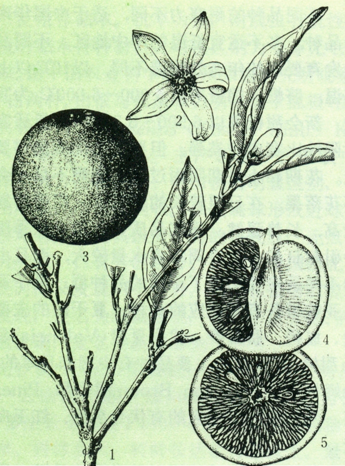 树冠中等大,圆头形或半圆形。分枝较密,幼枝有棱角,叶腋间常有小刺。叶椭圆形,叶翼较小,叶柄较短。花中等大、白色,单生或总状花序,萼片、花瓣均5片,雄蕊20~25,子房近球形。果圆形至长圆形,果皮淡黄、橙黄或淡血红色,较韧滑。有的果皮有明显的“柳纹”或果顶部有环形印圈。油泡平生微突,果肉橙黄色至血红色,柔软多汁、有香味。果皮与果肉不易分离。果心小而充实。囊瓣10~13,较难分开。种子多、少或无,因品种而异,卵形或长圆形,多胚,白色。染色体2n=18,也有三倍体、四倍体和六倍体。甜橙丰产稳产性强,在中国每公顷约产30~40吨。甜橙原产于热带亚热带,宜温暖、不耐寒、较耐阴,要求土质肥沃,透水透气性好。温度是影响甜橙栽培分布的主要因素。甜橙主要分布在年平均温度15℃以上的地区。-5℃是中国种植甜橙的安全北界,但作为优质的商品生产,极端低温多年平均值不能低于-1℃。甜橙枝梢和种子萌芽的最低温度为13℃,枝梢生长的最适温度范围为23~31℃,37~38℃时停止生长。不同品种的耐寒力不同,适于中国华南地区栽培的品种,多不适宜低温的华中地区。不同品种正常生长发育要求的年有效积温不同。以10℃以上计算的年积温,脐橙、锦橙等以5000~6000℃为宜,而暗柳橙、新会甜橙等以6500~8300℃为最适宜。甜橙的耐阴性比宽皮橘类强,但要高产优质仍需要较好的光照。花期和小果期阴雨过多,光照不足,会引起大量落花落果。在日照较长的情况下,甜橙对氮的利用率较高,长势强健,果实品质好。但夏秋季阳光过猛也会引起日灼。甜橙周年需水量较大,而且由于对水分的不同适应性形成了不同的品种群,夏干亚热带和夏湿亚热带各有其适应的品种。夏干区的主要品种有脐橙、血橙、脐血橙、伏令夏橙(Valencia)和Ca-denera甜橙。夏湿区的主要品种有中国和日本的品种,以及哈姆林甜橙,Parson Broun甜橙和Pineapple甜橙等。两种地区都适应的有伏令夏橙、红玉血橙和脐血橙。