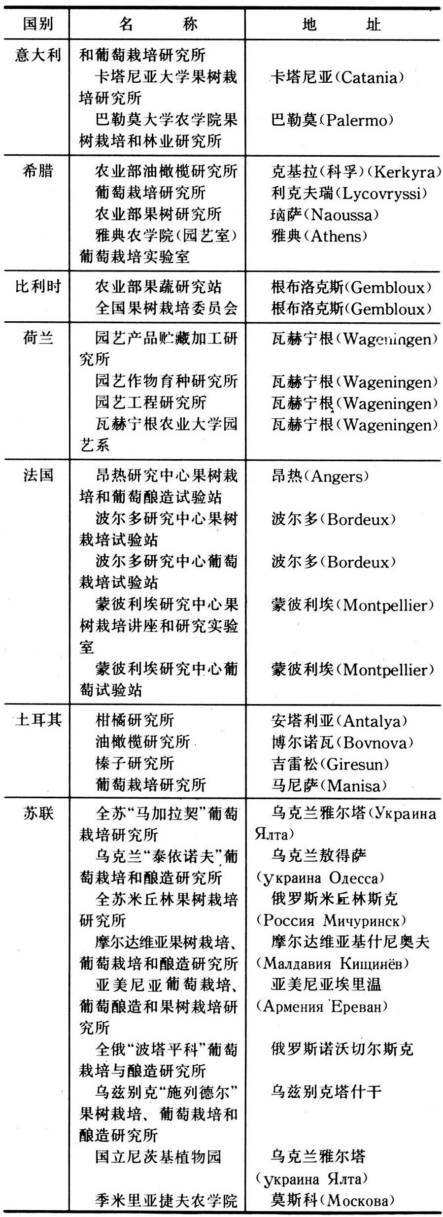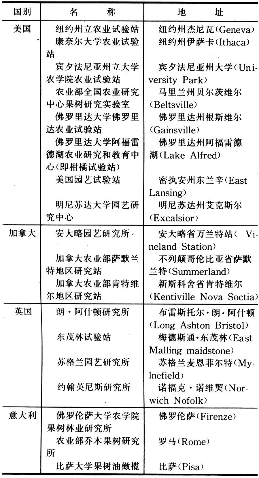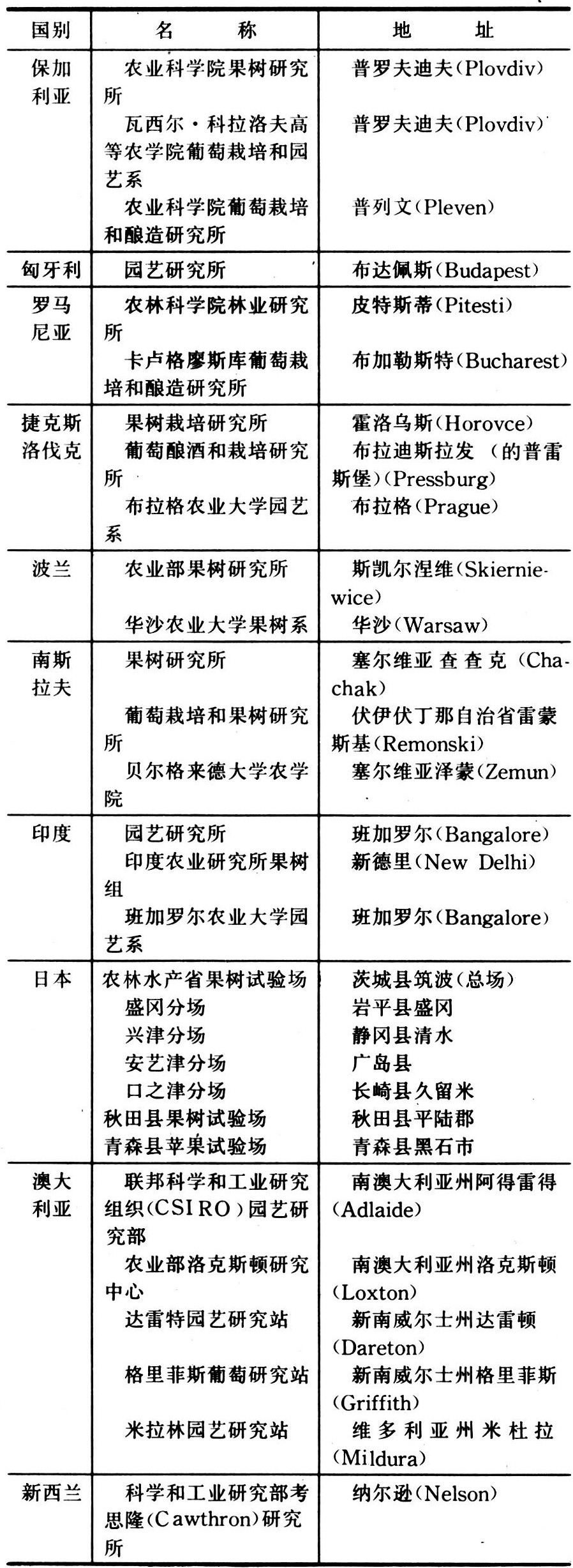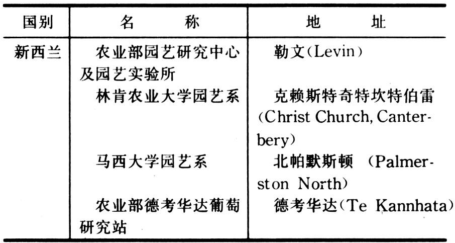 世界许多国家都设有专门从事果树科学研究的机构。列举20个国家主要从事果树科学研究的80多个单位(包括部分高等院校)见表: