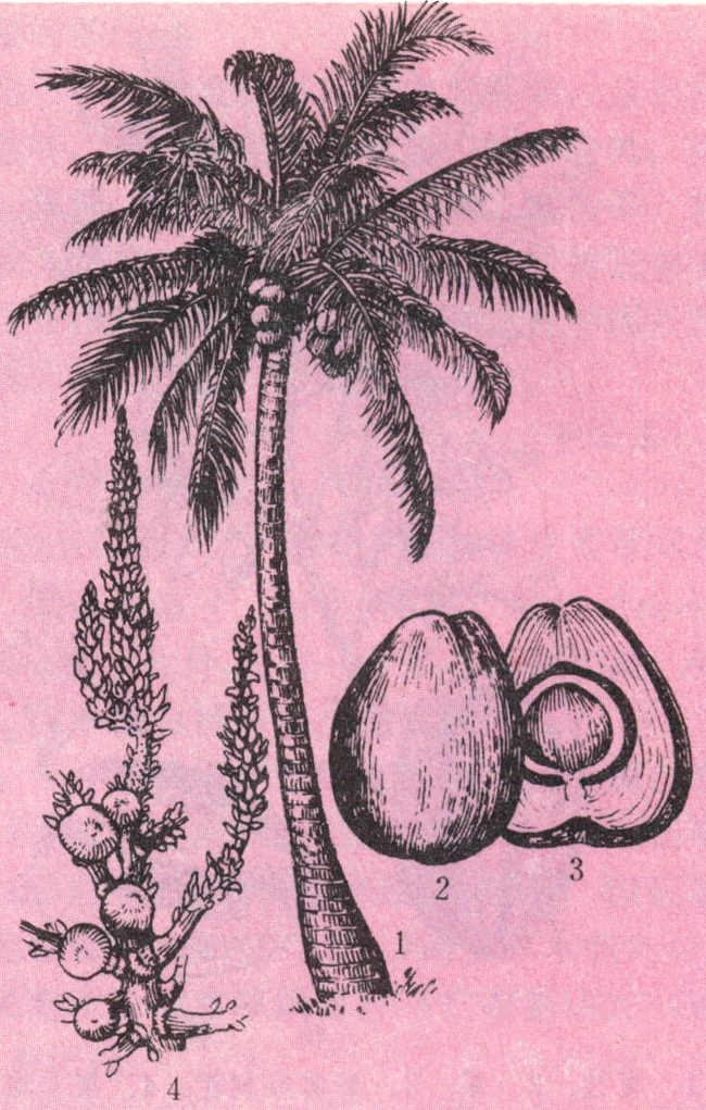 高10~20米,直立不分枝,树干具环纹。须根系。羽状复叶长3~8米,小叶多数,带状披针形,先端尖,基部背褶,背面浅绿色,叶柄基部具鞘状托叶,叶片螺旋状排列,每年长12片叶左右。肉穗花序生于叶丛中,佛焰苞细长;花单性,每花序上部密生雄花200~300朵,基部着生雌花1~5朵;雄花小,花被3小3大,雄蕊6;雌花直径2~3厘米,球形,子房3室,通常仅1室发育。核果大,径达25厘米,圆球形或椭球形,未熟时青绿色,熟时暗褐色;外果皮革质,中果皮纤维质,内果皮坚硬,基部具3孔,种子1;椰肉为固体胚乳,椰水为液体胚乳(见图)。椰子周年开花,海南7月至9月开花最多;花后一年果熟。