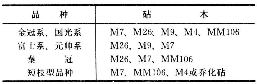 以苹果矮化砧木为例,一般生长势弱的品种、早果性品种或短枝型品种,选用半矮化砧木;生长势强的品种选用矮化砧木。中国引进的M系和MM系矮化砧木与苹果主要栽培品种的搭配列于下表。