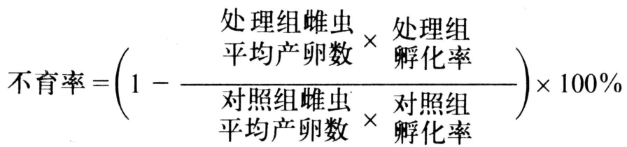 测定用昆虫如家蝇、蚊、小菜蛾、果蝇、粘虫、蚜虫等都应在标准条件下饲养。各项生理活动正常。测定的不育剂效果包括对雄虫和雌虫交配不能受精、雌虫产卵的抑制与虫卵孵化率的降低等。结果计算同杀虫剂毒力测定一样,用五个不同的梯度浓度或剂量得出相应的不育率,再用机率值分析法求出不育中浓度(SC50)或不育中剂量(SD50)。按下列公式算出: