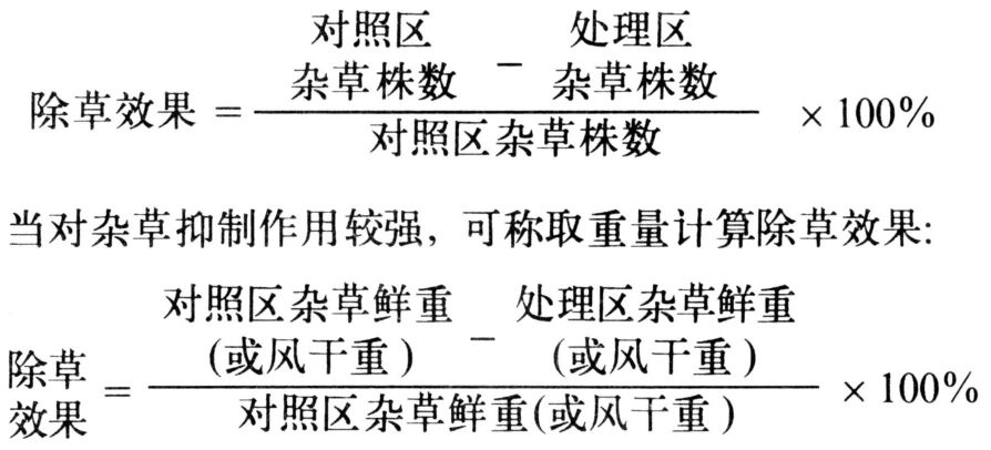 分别记载处理时杂草优势种的生育程度,发芽前或发芽后生育期(叶龄或草高)。记录施药后杂草的变化,如不出苗、生育受抑、失绿、畸形、枯死等症状。在药效达高峰期时,调查单位面积杂草优势种株数或地上部鲜重或风干重,或目测比较处理区和邻近对照区,估计相对杂草密度或个别优势杂草种群覆盖度,其结果用百分率表示(0为无防除效果,……,100%为全部防除)。除草效果等级表示有不同标准,常以欧洲杂草研究会(EWRC)1~9级,或美国杂草学会0~10级,或日本植物调节剂研究协会推荐0~5级为分级基础,可直接换成百分数0~100%级制。