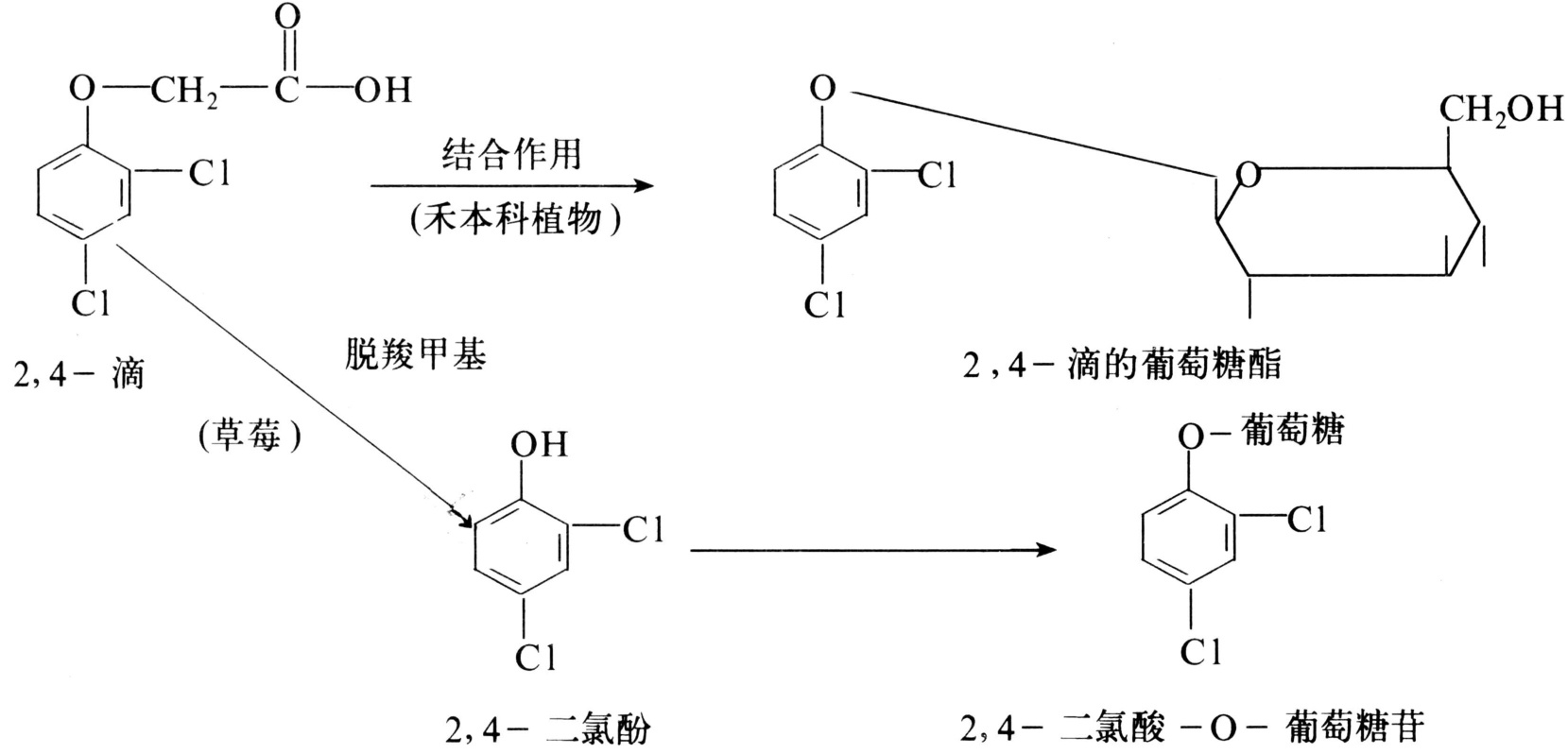 植物本身的代谢和解毒能力不同而引起的选择性。植物体中,在酶和非酶物质作用下,将有植物毒性的除草剂,通过代谢作用(氧化、还原和水解等作用)转化为无植物毒性的代谢物,或与植物体中的天然物(糖、氨基酸、谷胱甘肽)形成轭合物,或与植物体中的聚合物形成结合残留物。因此,这类选择性取决于植物体中这类特异酶或非酶物的存在与否和活性高低。还有些除草剂,本身并没有植物毒性,通过植物代谢生成的代谢物才有植物毒性,这种作用称为活化作用。生化选择性由两种因素构成:①不同植物对除草剂的代谢作用不同。有些关键的代谢作用,在一些植物中存在,在另一些植物中不存在。禾本科植物对2,4-滴具有抗药性是因为体内的葡萄糖易和2,4-滴形成水溶性的结合物而解毒。草莓对2,4-滴的抗药性是因为能使2,4-滴的侧链脱去羧甲基,生成二氯苯酚及其糖苷而解毒(图1)。