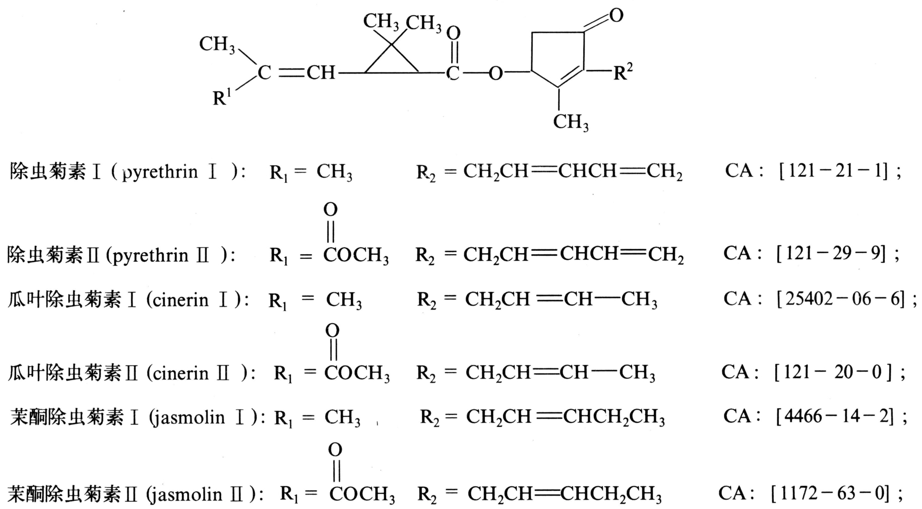 一种抑制神经组织,源于除虫菊的触杀性植物源杀虫剂。存在于菊科(Compositae)菊属(Chrysanthemum)除虫菊亚属(Pyrethrum)的若干种植物的花中,白花除虫菊(Pyrethrum cinerariaefolium)因所含杀虫有效成分较高,为唯一大规模栽培作杀虫剂用的品种。主要利用干花和提取物。商品名有除虫菊、Pyrenone、Pyrocide、Prentox、Pyronyl等。天然产物中已判明具有杀虫活性的有效成分有六种。化学结构式通式: