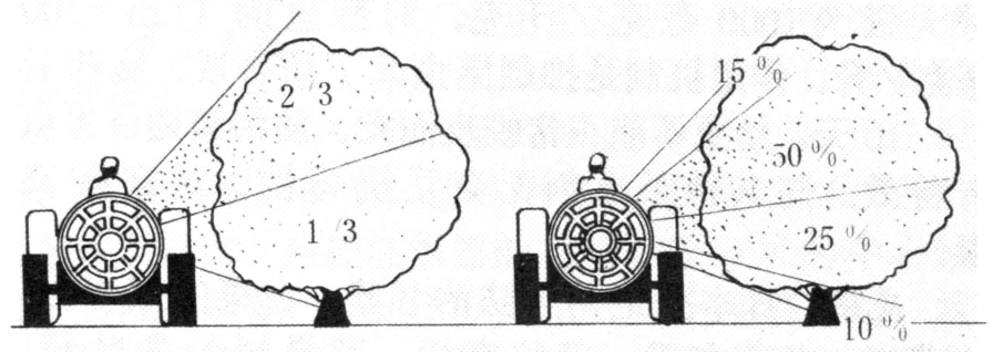实现定向喷雾的技术措施主要有四种:①喷头的配置。按对作物的喷雾要求把喷头安装在喷杆架的一定位置和角度,使雾流可喷到作物的特定部位上(图1)。②风送式定向喷雾。用强大的气流把雾流喷送到作物(或果树)上。并可结合喷头角度的调节把雾流喷到树冠的特定部位上(图2)。各种风送液力喷雾机均可用于此目的。但对于果园用的风送式喷雾机不仅要求把农药喷到树上,而且要求雾流能透入树冠。因此必须根据各种林果树木的树冠结构特点和大小来选择适当的风机。并须根据喷雾机与树木的距离来选择气流的速度和流量,使气流能够把雾流有效地送到树上。超低容量喷雾一般属于飘移喷雾;但是配装风机后,即可变成一种定向喷雾机具,利用风机产生的气流把细雾吹送到作物上。③间歇喷雾。利用控制装置使喷雾机具的喷撒部件在离开作物时自动停止喷雾,与作物相遇时再自动喷雾。例如一种光电自控间歇喷雾机(photoelectric operated intermittent sprayer),只在喷头对准作物时才能喷雾,脱离作用后由光电管自动切断喷雾。④笼罩喷雾。用塑料膜在特制的支架上做成马鞍形的罩,可以笼罩在作物上行走;在罩内配置若干喷头,针对作物进行喷雾。未喷到作物上的部分药液被喷到塑料罩的内侧并流到罩的下缘,用集液槽收集后,通过抽吸系统,吸回药液槽重复使用(见)。喷撒灭生性除草剂为了防止危及周围的作物,须在喷头部安装一马蹄形罩,使喷出的雾流只能在罩下的杂草上沉积。
