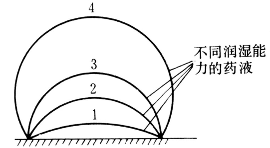 表面张力越小则越容易发生流失,从而残剩在表面上的药液量也越少。因此,在一定范围内,药液的堆积度与表面张力表现为正相关(见图)。图中从1到4代表逐渐增大的表面张力,球面表示在此种表面张力下所能达到的药液堆积度。当药液量超过此球面时,开始出现流失。流失发生以后,最后残剩的药液表面均低于流失前的球面。表面张力较大的药液,其流失后的残剩药液降低较显著。但是实际上不存在水平状态的叶表面,而在倾斜的表面上更容易发生流失。因此在叶片上药液通常堆积在倾斜表面的下缘。