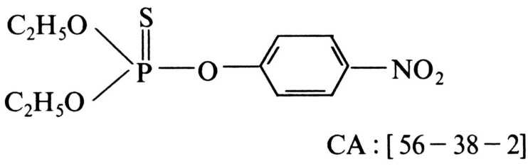 高毒广谱性硫逐式一硫代磷酸酯类杀虫杀螨剂,中国也称作一六〇五(E—605)。化学结构式: