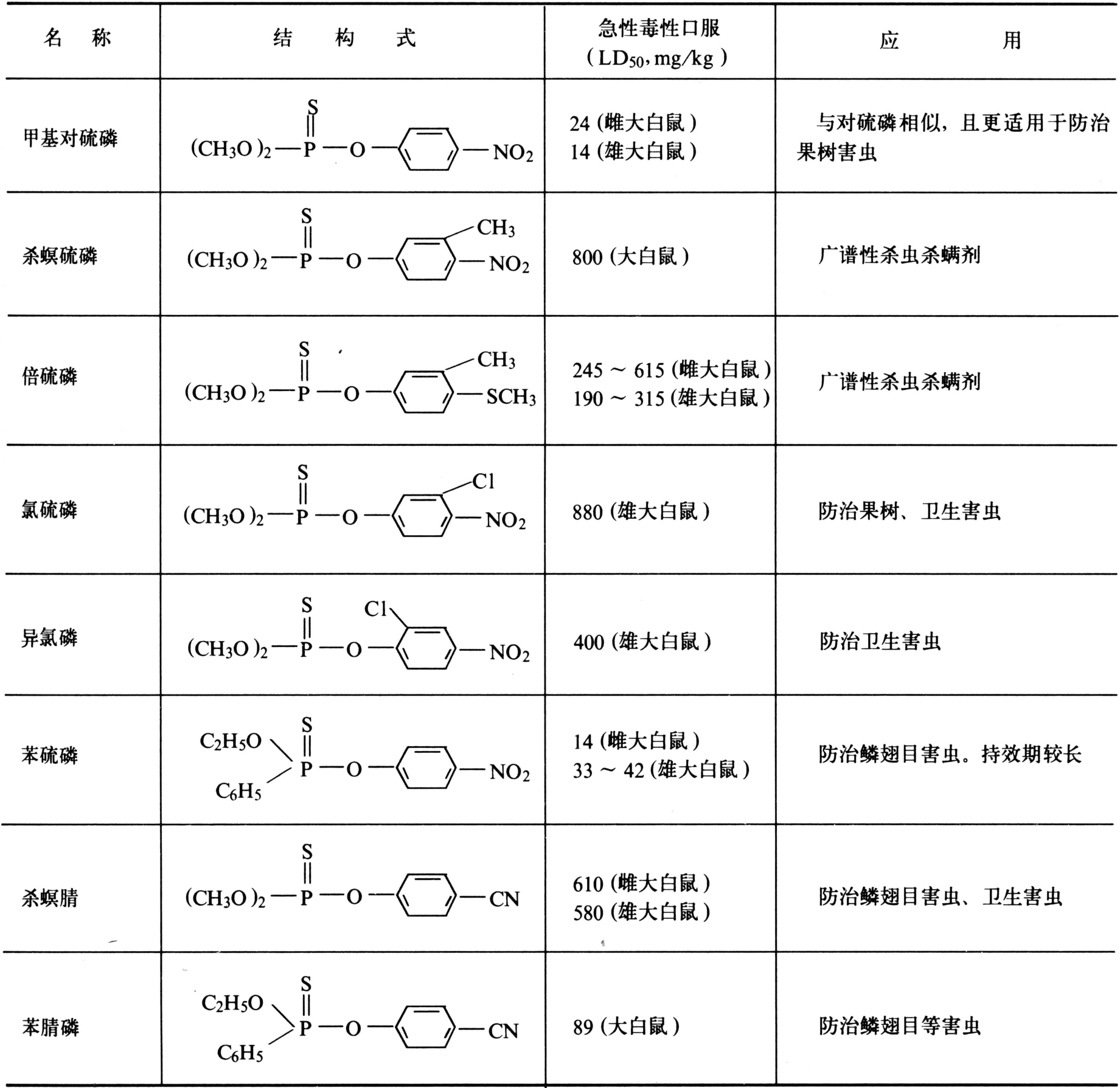 近似品种有甲基对硫磷、杀螟硫磷等8种(见表)。
