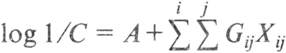 式中 log1/C为生物活性;A为基准化合物的理论活性的对数值;Gij是分子中第i个取代基在第j个位置上对分子活性的贡献;Xij是指示变量,只取1或0两个值,用以表示第i个取代基在第j个位置上的有或无。根据分子的结构及活性,利用上式可写出一系列方程,然后使用最小二乘法解此方程组,从而可以算出某个取代基在某一位置上对分子活性的贡献。