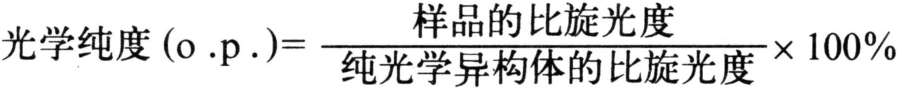 例如,若一个纯的光学异构体比旋光度为(+)50°,而另一个不纯的光学异构体,比旋光度为(+)30°,那么,此不纯光学异构体的光学纯度即为60%。一种纯的光学异构体光学纯度为100%,外消旋体的光学纯度为零。