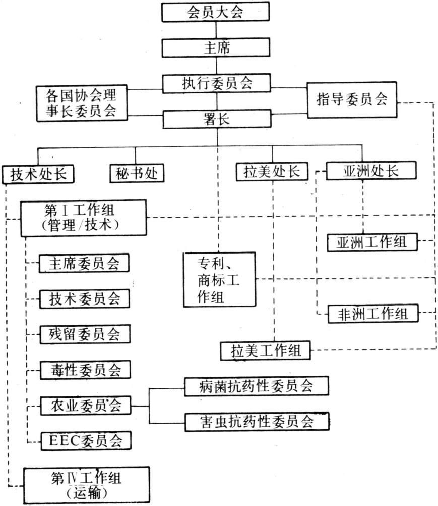 GIFAP现有21个正式的和30个非正式的团体会员。51个会员所代表的公司逾1000个,所生产的农药,占世界农药产量的90%以上。GIFAP的最高机构为会员大会(General Assembly),由各正式会员国的一名代表组成。大会的主席、副主席和执行委员会的成员由会员大会的成员中选出。其下设机构如图所示。各委员会和工作组的职能如下:①农业委员会。负责化学及生物农药的生物活性、作物生态、生态副作用、害虫防治及应用技术等问题,下设害虫抗药性和病菌抗药性两个委员会(简称IRAC和FRAC),最近又增设了杂草抗药性委员HRAC;②残留委员会。负责化学农药的残留,及其管理与评价;③技术委员会。负责化学和生物农药的理化性质,及其质量标准;④毒性委员会。负责农药登记所需毒性试验及化学和生物农药的毒性事宜;⑤EEC委员会。与欧洲共同体联系;⑥第Ⅰ工作组。处理有关农药生产、分析方法、应用、毒性、残留等问题;⑦第Ⅳ工作组。负责铁路、公路、海空运输等问题。各地区工作组则处理相应的地区问题。