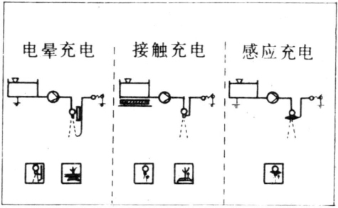 使药液雾滴带电的方法有三种:接触充电(contact charging)、电晕充电(corona charging)和感应充电(induction charging),见图1。①接触充电。高压静电发生装置的高压输出端与药液在喷雾系统内接触,使药液带电,故有较高的充电效率,雾滴喷离喷头时带有电荷,充电电压一般较低,并要求喷雾机有较好的绝缘措施。②感应充电。高压静电发生装置的高压输出端连接在喷头附近的感应电极上,药液雾滴从喷头喷出后经过感应电极形成的高压电场而带电。③电晕充电。高压静电发生装置输出端与数根细金属棒相接,细棒兴端高压放电使周围空气分子电离成正负离子,金属细棒吸引中和异性空气离子。同性离子被排斥,吸附在雾滴上形成带电雾滴。感应和电晕充电方法其高压静电是作用在喷出的药液雾滴上,充电效率较低,可使用较高的充电电压。