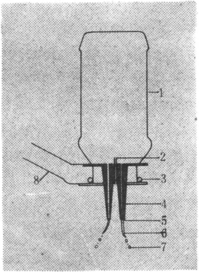 有两种基本类型。第一种类型的静电喷雾机是在常规喷雾机上安装高压静电发生器,以交流发电机或直流电源(干电池、蓄电瓶)转换为交流电进行倍压整流,采用上述三种充电方法中的一种将高压静电引向喷头,就可为药液雾滴充电。静电喷雾机上应装接地线,使机身与大地接通保证安全。第二种类型称静电场力雾化喷雾器,它的喷嘴芯与高压静电发生器相接,绝缘外套上的电极接地并与喷嘴芯保持一定的垂直和水平间距,当药液从喷嘴芯的环形缝隙流出时,就被喷嘴芯与外套间的电场力雾化(图2)。