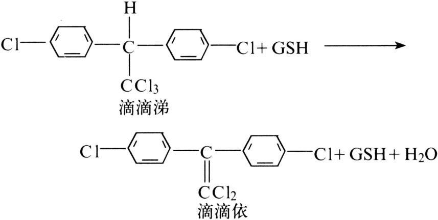 可使滴滴涕除去一分子氯化氢而降解为无毒滴滴依的酶,简称滴滴涕—酶,它对滴滴涕类似物也有催化作用。此酶须有谷胱甘肽(GSH)存在时才有活性,但是谷胱甘肽并不参与酶促反应(图1)。它可为1,1-双(4-氯苯基)乙烷(DMC)或F-DMC所抑制。滴滴涕-酶是某些滴滴涕抗药性家蝇和埃及伊蚊的抗药性机制,有些昆虫也可使滴滴涕代谢降解,但测不出滴滴依,DMC也不增效,可能为其他机制所致。