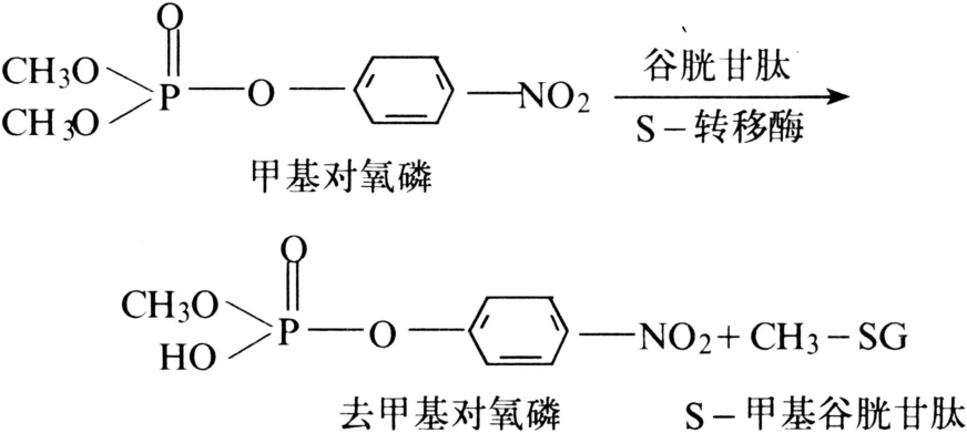 主要对有机磷化合物起降解作用的酶,是有机磷抗药性的重要机制。它可裂解有机磷杀虫剂的O-烷基部位(主要是对二甲基磷酸酯和二甲基硫磷酸酯),芳基和酸基等部位,而去烷基的产物比去芳基的多。此酶在谷胱甘肽参与下,可替换杀虫剂不稳定的部位,成为无毒代谢产物——有机磷底物与谷胱甘胱的复合体(图2)。