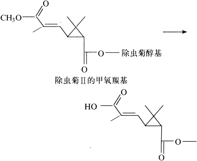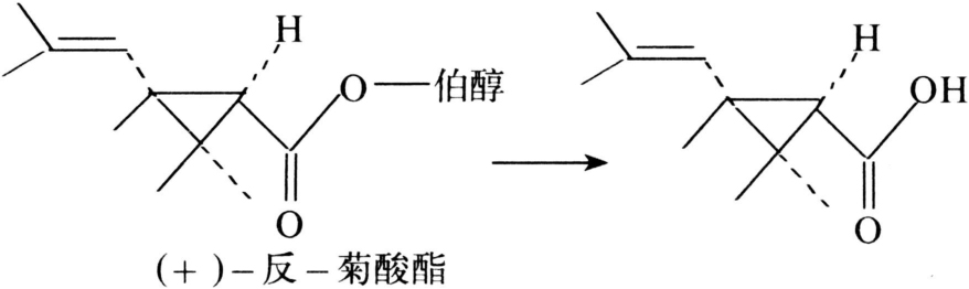 对降解带有羧酸酯基的二硫代磷酸酯等起重要作用的酶。例如,可将马拉硫磷代谢为α单酸和β单酸产物,二者均无毒性(图3)。但在有些情况下,此酶会伴随着一个酯酶变性和底物特异性变化的现象。有机磷抗药性和以α-乙酸萘酯、β-乙酸萘酯和丁酸甲酯以及其他酯类为底物的变性羧酸酯酶(或称非特异性酯酶)活力之间的关系为:抗药性有时与非特异性酯酶低活力有关或有时是与其高活力有关。羧酸酯酶的抑制剂为磷酸三苯酯(TPP)、三-O-甲苯磷酸酯(TOTP)、SSS-三丁苯三硫赶磷酸酯(DEF)和对硫磷、地亚农等,它们都可以克服昆虫对马拉硫磷的抗药性。昆虫对马拉硫磷产生抗药性是由于体内羧酸酯酶活性增加。此酶也可使拟除虫菊酯的羧酸酯水解:使除虫菊Ⅱ的甲氧羰基水解为低毒物质(图4);对带有反式侧链的环丙烷羧酸伯醇酯也易水解为低毒物质(图5)。由于此酶对(+)-反式异构体要比相应的(+)-顺式异构体水解快,所以昆虫对反式异构体易产生抗药性。