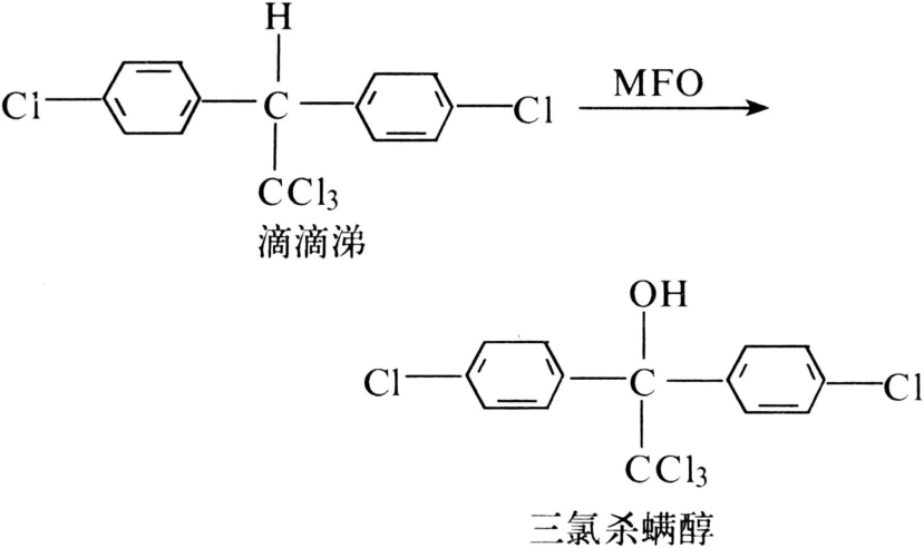 在某些家蝇、德国蜚蠊、锥蝽、果蝇、库蚊和谷象等昆虫体内,滴滴涕的解毒途径主要是微粒体多功能氧化酶的羟基化作用,产物为三氯杀螨醇(图6)。昆虫对滴滴涕抗药性是与此酶的羟基化作用有关: