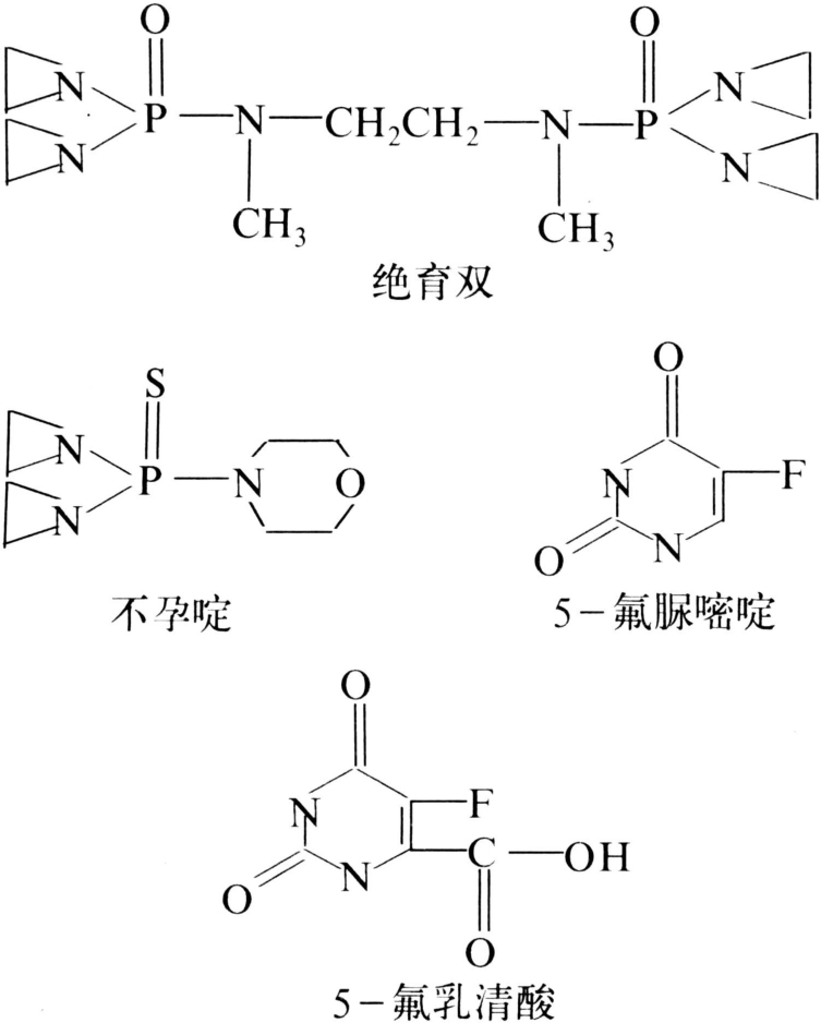 1960年,拉布雷克(G.C.La Brecque)等试验证明,2,4,6-三亚乙基亚氨基均三嗪和不孕啶能使家蝇不育,阐明了利用化学不育剂防治害虫的可能性,促进了化学不育剂的发展。20世纪60年代筛选出了一些较好的昆虫不育剂,在实际应用方面也获得一些成功。品种类型依作用性质,可分成:①烷基化剂。如绝育磷、不育特、绝育双等含氮丙啶环的有机磷化合物,具有活性高、广谱的特点。