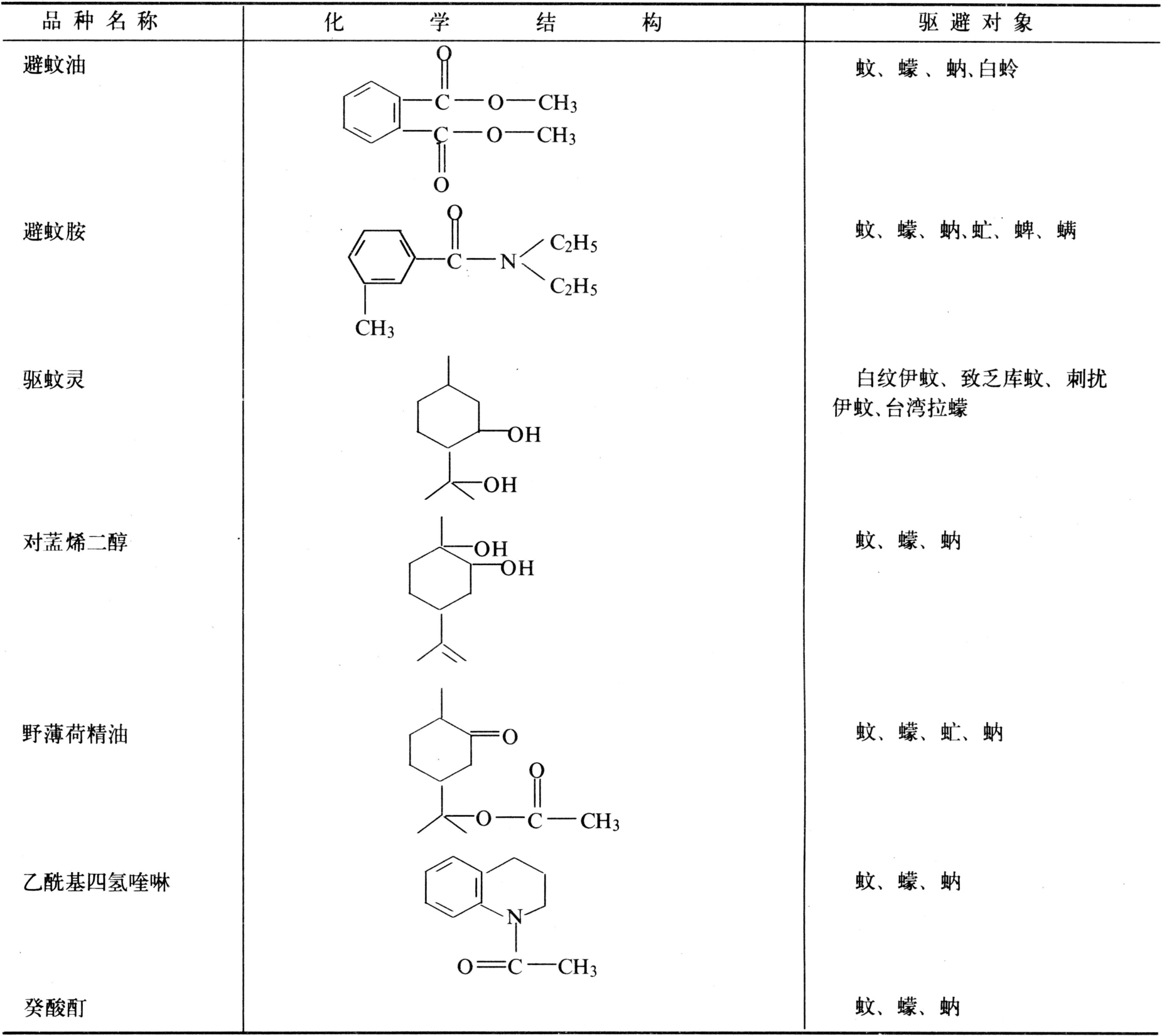 现在实用化的都是防治卫生害虫的驱避剂,主要品种见下表。