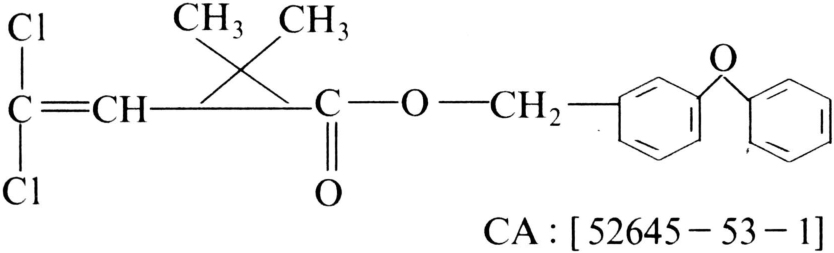 第一个对光稳定的合成拟除虫菊酯杀虫剂。商品名和其他名称有二氯苯醚菊酯、苄氯菊酯、除虫精、Ambushfog、Kafil、Perthrine、Picket、Dragnet、Pounce、Talcord、Outflank,Eksmin等。有四个光学异构体。化学结构式: