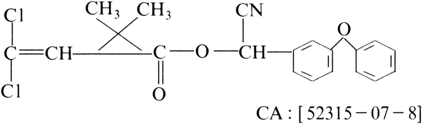 对光、热稳定,生物活性较高,含氰基的合成拟除虫菊酯杀虫剂,商品名有安绿宝、灭百可、赛波凯、兴棉宝、Arrivo、Ripcord、Cyperkill、Cymbush等。有八个光学异构体。化学结构式: