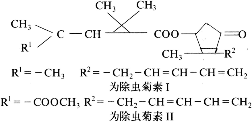 现在天然除虫菊花的杀虫有效成分已明确有6种(见),并已阐明它们的分子结构具有立体异构和光学异构且生物活性差别很大。