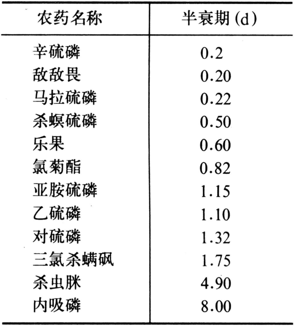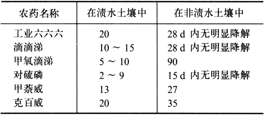 是评价农药对环境污染的指标之一。各类农药在渍水和非渍水土壤中的半衰期相差很大,如有机氯杀虫剂在渍水土壤中,由于微生物的作用而迅速降解,半衰期仅10~20天,在非渍水土壤中有时高达1~3年。表1中列出了几种农药的半衰期。农药在土壤中半衰期的长短,不仅直接影响栖身于土壤中的动物和微生物生长,还影响作物从土壤中吸收农药及对大气、河流和地下水的污染。