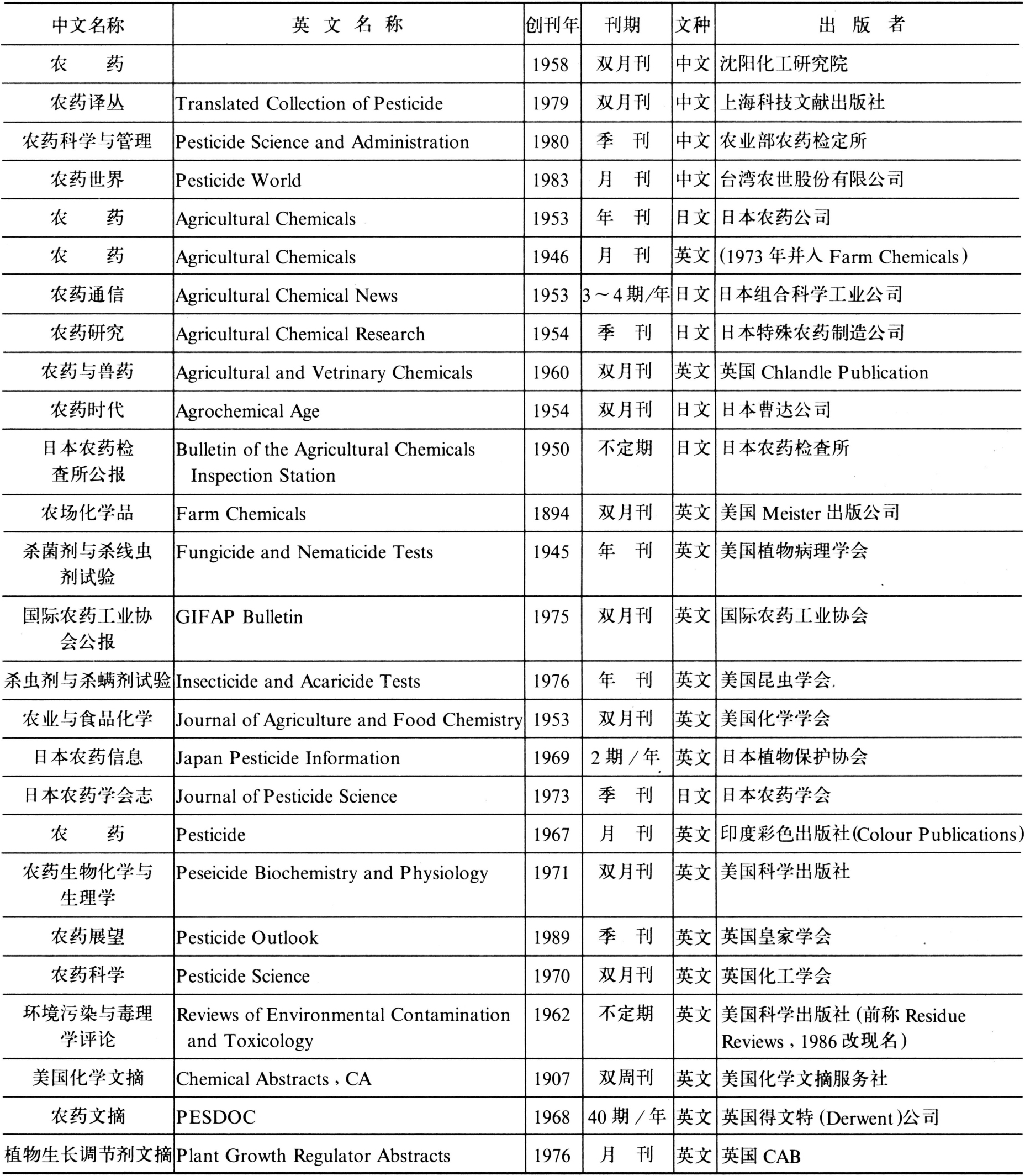 目前虽然有了一些专业性的农药期刊,但大量的农药研究报告、述评、信息仍然散处在与农药有关的各种杂志上。如《美国化学会志》(Journal of the American Chemical Society)、《有机化学》(Journal of Organic Chemisty)、《德国化学会志》(Chemische Berichte)、《应用化学》(Angewandte Chemie)、《英国化学会珀金汇刊罗》(J.C.S.Perkin TransactionsⅠ)、日本的《农业与生物化学》(Agricultural and Biological Chemistry)、《日本化学会志》(Bulletin of the Chemical Society of Japan)以及AOAC(Journal of the Association of Offial Analytical Chemists)、《经济昆虫学杂志》(Journal of Economic Entomology)、《作物保护》(Crop Protection)、《植物病理》(Phytopathology)、《杂草科学》(Weed Science)、《植物生长调节杂志》(Journal of the Plant Growth Regulation)、《化学生态杂志》(Journal of Chemical Ecology)、《环境污染与毒理学公报》(Bulletin of Envirovental Contamination and Toxicology)等外文期刊和中国的《化学学报》、《高等学校化学学报》、《昆虫学报》、《植物病理学学报》、《杂草学报》、《植物保护学报》、《植物保护》、《昆虫知识》等刊物上均刊载农药的研究报告或信息。