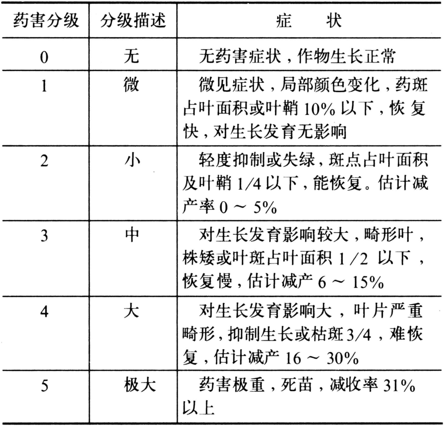 药害恢复速度分级:快(处理后7~10天恢复),中(处理后10~20天恢复),迟(处理后20天以上恢复)。