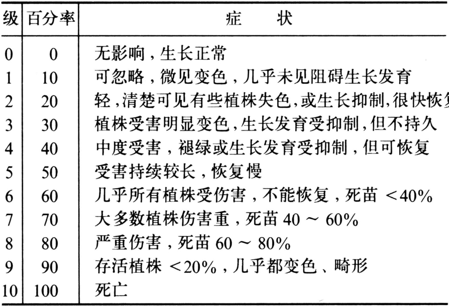 分为绝对值、直观估计值和百分率分级三种。用绝对数值表示的,如药害发生的频率(某一生长期植株数目或可见症状数)及一些测量数值(如高度、长度、直径、分蘖茎数、植株或器官的重量)等。用直观估计值表示的,如畸形及失色、叶枯程度的估计值,可参照0~5或0~10级药害分级标准得出结果,估计每小区药害(表1、2)。在实际应用当中,上述药害最终的调查,可将处理小区和不施药对照区进行比较计算百分率(如作物高度、覆盖度等),进行评价。