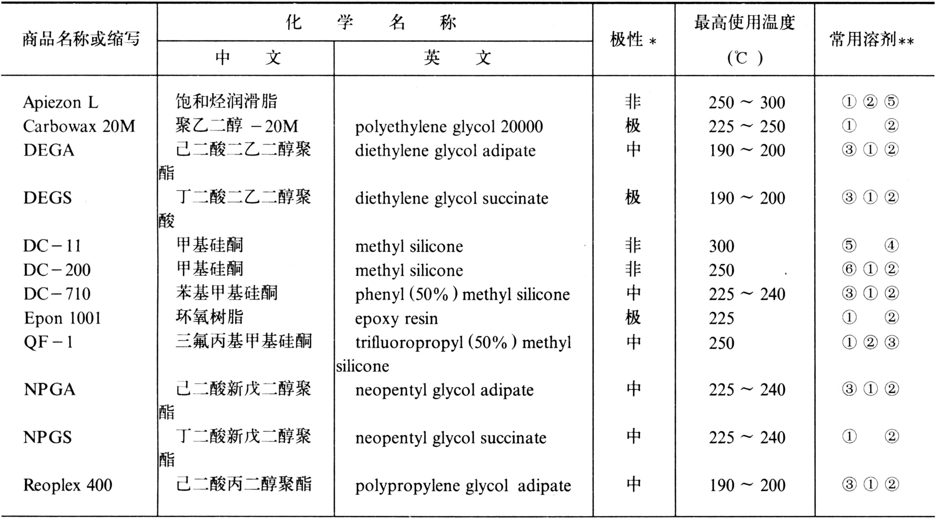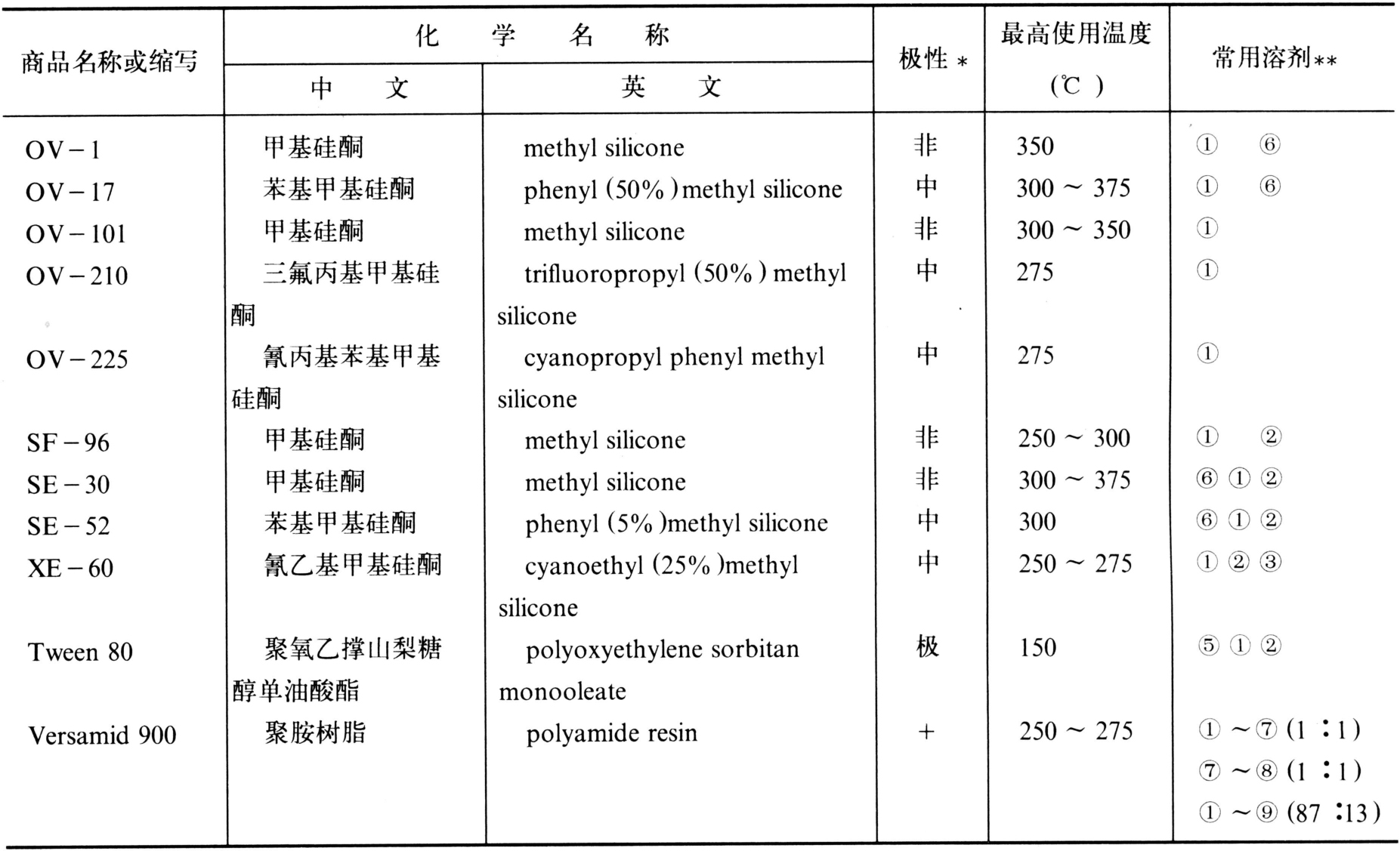 固定液的选择对试样的分离有极其重要的作用。为了探索一项分析方法,有时几乎花费几个月的时间来选择固定液。罗尔施奈德(L.Rohrschneider)和麦克雷诺兹(W.O.Mcreynolds)对固定液分离特征的研究工作,奠定了选择固定液的实用方法。这些方法是:①相似相溶原理;②流出规律;③近邻技术;④用最常用的固定液实验(实验方法);⑤查阅文献资料手册;⑥利用固定液选择表;⑦利用电子计算机。在农药分析中,多按相似相溶原理结合用“实验方法”来选择固定液。农药分析常用固定液见表1。
